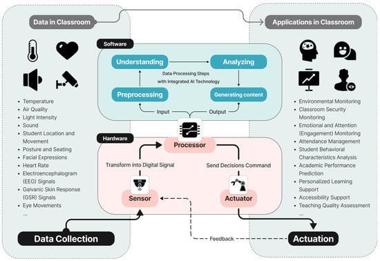 The advancement of sensor technology in smart classrooms is contingent upon the development of hardware and the implementation of software algorithms. In particular, the integration of artificial intelligence technology enables sensor systems to process and analyze data with greater efficiency, thereby enabling the generation of more nuanced and personalized content, which in turn facilitates the delivery of higher quality educational services. In systems comprising sensors, actuators, and processors (as shown in Figure 2), the primary function of software algorithms is to (1) filter the data collected by the sensors, (2) comprehend the data, (3) analyze the data, (4) generate content, and (5) output content to the actuators.