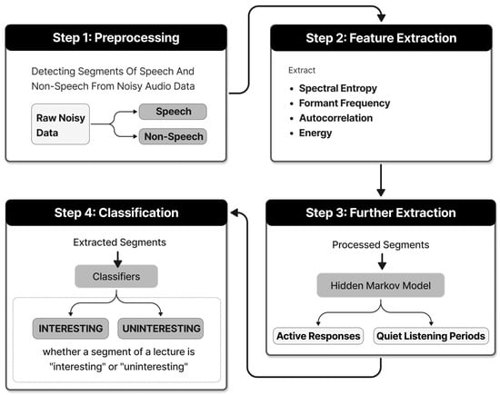 Gligoric et al. and Basu [37,38] employed a basic microphone to collect data on classroom speech, to analyze and classify audio features including spectral entropy, formant frequency, autocorrelation, and energy, and to convert audio signals into a representation of the current level of students’ learning interest. This is achieved by combining machine learning algorithms. Advanced sensor technology can also facilitate the monitoring of student engagement through a multitude of modalities. Spikol et al. [4] utilized the Kinect One camera to monitor undergraduate engineering students’ facial and hand features while using the camera’s built-in microphone to monitor the sound level and frequency of students’ voices. Chiou and Tseng [18] proposed a smart classroom management system deployed in an experimental classroom environment. A Wireless Sensor Network (WSN) based on Zigbee technology was created in the paper, which used camera and microphone sensors to monitor students’ inattentive behaviors and alert them with LED lights and bracelet vibrations.
