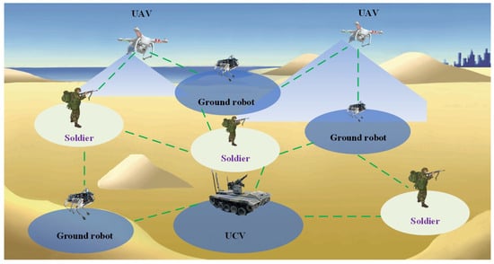 In recent years, the U.S. military has proposed new combat styles such as multi-domain joint operations [1], mosaic warfare [2], distributed operations [3], and swarm drone operations [4]. These combat styles emphasize dispersed forces and intelligent collaboration. A typical example is the tactical edge network [5], whose structural composition is shown in Figure 1. This network integrates combat soldiers with unmanned combat units such as drones, ground robots, and unmanned combat vehicles, forming small, sophisticated, and powerful joint units. These units are capable of rapid and precise strikes, thereby creating advantageous windows across the entire battlefield and accomplishing combat missions such as key area seizure and urban warfare.