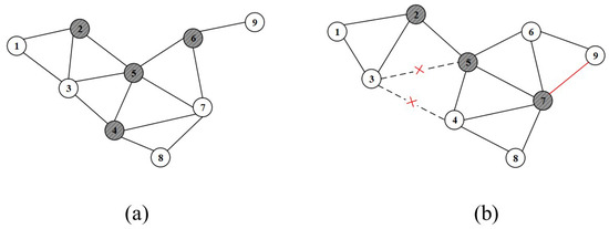 Figure 4 is a snapshot of the network topology at different times. At time , the network topology snapshot is shown in Figure 4a. The dark-colored nodes 2, 4, 5, and 6 represent the virtual backbone network formed at . As time progresses, at time , the network topology changes as shown in Figure 4b. The changes include the disconnection between nodes 3 and 4, as well as between nodes 3 and 5. Additionally, a new connection is established between nodes 7 and 9. The backbone nodes at time are now nodes 2, 5, and 7.