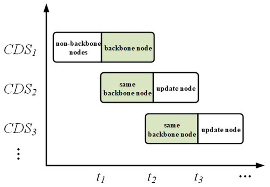 5. Periodic Updates of MCDSs: To effectively respond to continuous dynamic changes in the network, the algorithm periodically checks and adjusts the alternative CDSs (MCDSs) according to a predefined schedule. Once the number of available MCDSs falls below a critical threshold of 2, the algorithm initiates the MCDS construction process again. This ensures that even under significant changes in network conditions, the backbone network maintains its coverage and connectivity. When the network topology changes, the scheduling process is re-executed based on Algorithm 2, which is the backbone network maintenance algorithm based on multi-CDS scheduling, to adapt to the new network environment.