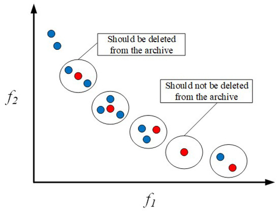 Figure 6 illustrates the process of removing solutions from the archive set. In the context of minimizing objectives, the small circles depicted in the figure represent individual solutions within the archive. Each solution’s crowdedness in its respective area is evaluated by calculating the number of neighboring solutions within a certain distance range (represented by the large circle) around each solution. In areas with high congestion, it means that there are more solutions in that region, making these solutions more likely to be selected for removal. Conversely, if the number of neighboring solutions is smaller, it indicates that the region where the solution is located is relatively sparse, and such solutions should be preserved. In the figure, the red circles represent the current non-dominated solutions in the archive, while the blue circles represent newly generated solutions or neighboring solutions that need to be evaluated.