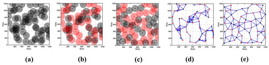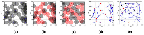 Figure 9a,d depict the initial coverage area map and node connectivity graph for this scenario, showing a scattered distribution of network nodes and poor network connectivity. Significant coverage holes and redundancy are observed in the central part of the monitoring area, resulting in a relatively low overall network coverage rate. Figure 9b shows the use of the CDS algorithm to select 21 backbone nodes (highlighted in red) from an initial distribution of 60 nodes to establish an efficient and effective backbone network.