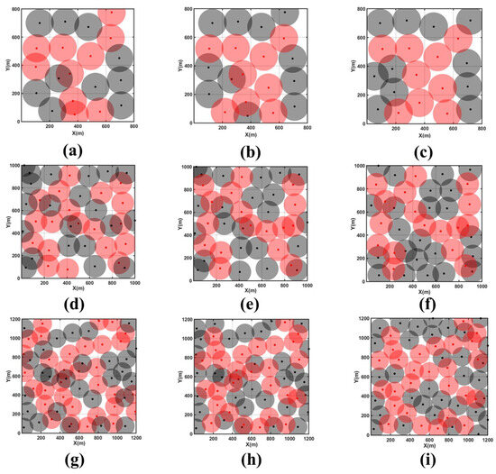 Coverage optimization in three scenarios. (a) Initial topology in Scenario 1, (b) CDS backbone network update in Scenario 1, (c) MOEMPA location optimization in Scenario 1, (d) initial topology in Scenario 2, (e) CDS backbone network update in Scenario 2, (f) MOEMPA location optimization in Scenario 2, (g) initial topology in Scenario 3, (h) CDS backbone network update in Scenario 3, (i) MOEMPA location optimization in Scenario 3.