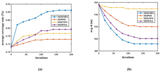 To comprehensively evaluate the performance and specific trends of the MOEMPA, MOGWO, MOWOA, and MOPSO algorithms during the iterative process, this study compared their convergence curves in terms of network coverage rate and average node movement distance. Figure 11a illustrates that the convergence curves of average coverage rate for all four algorithms exhibit initial rapid improvement, followed by a gradual slowdown and eventual stabilization. This reflects the algorithms’ strong global search capability in the early stages, enabling them to quickly approach optimal solutions, while demonstrating robust local search capability in later stages to achieve convergence. Importantly, the MOEMPA algorithm proposed in this study outperforms the other three algorithms in terms of performance. This advantage stems from the top predator selection strategy integrated into MOEMPA, which enhances convergence speed and solution distribution quality, making the algorithm more effective in pinpointing optimal solutions.