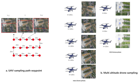 UAV images were captured using a DJI Phantom 4 Pro drone, flying at altitudes of 120–200 m above ground (in 20-m intervals), as shown on the right side of Figure 2. The DJI Pilot program’s waypoint flight feature was used for photography, ensuring shots were taken at the same waypoint positions across different altitudes. Choosing university areas for shooting offers two advantages: 1. The buildings and other landscape features in universities are distinct, facilitating subsequent feature extraction by deep learning models; 2. Buildings on campuses are generally not too tall, ensuring the safety of drone flight paths during image capture. To ensure spatial continuity and dense sampling in the dataset construction, the drone’s flight path design considered sampling density, with a sampling distance of 20 m, contributing to the uniform distribution of the dataset. Additionally, overlapping portions in images from adjacent shooting points help the model enhance its ability to discern subtle differences.