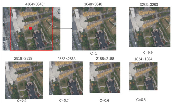 UAV images were captured in real scenes at various flight altitudes. The resolution of UAV images is (4864, 3648). To improve the model’s adaptability to multiple altitudes, we crop UAV images from different heights with different parameters to simulate images from more altitudes. We aim to build a dataset encompassing ground features under more conditions. Figure 3 below shows the cropping situation for UAV images at 200 m altitude, where c is the cropping ratio. All cropped images share a common center point. The crop size gradually decreases. In subsequent model calculations, these UAV images will be reshaped to a uniform size of 256 × 256. Therefore, the larger cropped images will contain a wider range of ground features, while smaller cropped images will contain more ground details. This improves the model’s adaptability to multi-scale features. When UAV images are from 80 to 100 m, no cropping is conducted to ensure sufficient large-scale ground features in the images.
