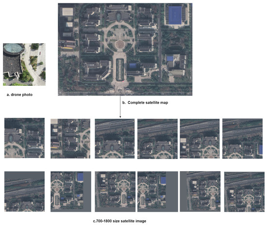 The test set at 120–200 m altitude includes 120 sampling points, 600 UAV images, and 7200 satellite images. The test set at 80–100 m altitude includes part of the UL14 dataset’s test set, with 100 sampling points, 300 UAV images, and 3600 satellite images. In the test set, each UAV image corresponds to 12 satellite images containing that UAV image. These 12 satellite images are local crops from a satellite image covering the entire school. The UAV image is positioned differently on each of the 12 satellite images. The satellite image crop sizes range from 700 to 1800, corresponding to actual coverage areas with side lengths between 180 m and 463 m. The testing phase involves locating the UAV image on the 12 satellite images. In creating the test set, we considered real-world challenges in cross-view matching geolocation such as scale transformations and position offsets. Therefore, each UAV aerial photo corresponds to 12 satellite images of different spatial scales, and the position of the UAV image within the satellite image is randomly generated (Figure 4). This test set design increases the difficulty of geolocation, better aligning with actual UAV working scenarios.