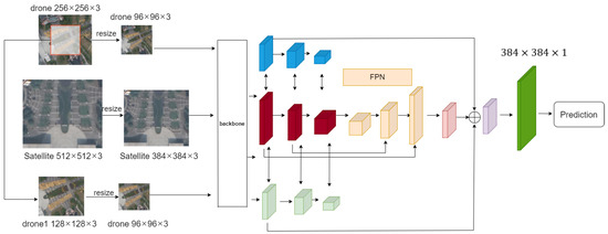 The backbone is MH-PCPVT, the neck is FPN, and the detection head restores the feature map to the size of the satellite image through linear interpolation.The blue part is the feature map produced by the large drone map. The red part is the feature map produced by the satellite image. The green part is the feature map produced by the cropped small drone map.