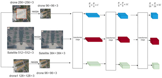 As shown in Figure 6, the input of MH-FPI is two drone images with a size of 96 × 96 × 3 and a satellite image with a size of 384 × 384 × 3. We divided the drone image into 24 patches and the satellite image into 96 patches, each with a size of 4 × 4 × 3 (transformer stage in Figure 7). We then fed them into a linear projection, reshaping them into two-dimensional patches with sizes × C1 and × C1 (C1 is the number of channels in the first stage). Finally, we combined them to create an embedded patch with a size of ( + + ) × C1.