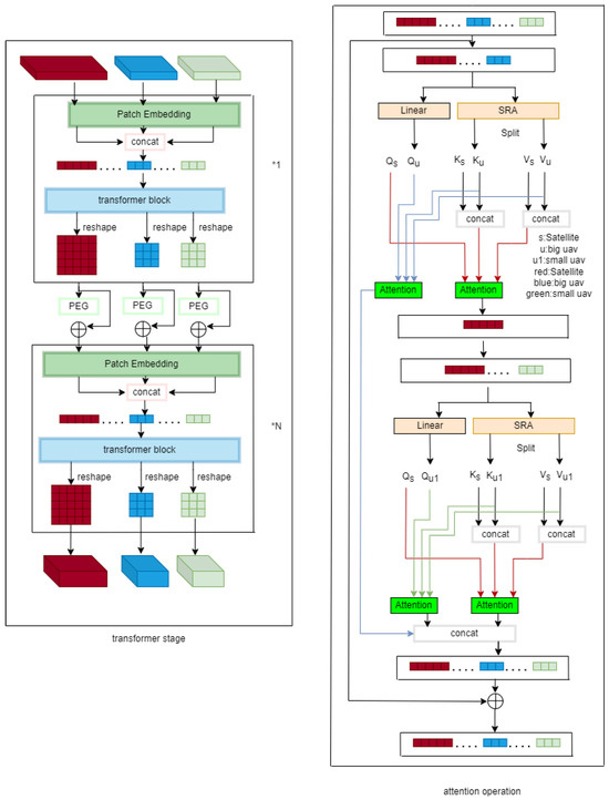 The right side of Figure 7 shows the attention mechanism part. In transforming input patches into K and V, we continue to use the SRA module [19] method to reduce computational load. First, the drone and satellite patches are transformed into Qu, Ku, Vu for the UAV and Qs, Ks, Vs for the satellite image through linear transformation and SRA. The UAV image first undergoes self-attention, followed by cross-attention between the UAV and satellite images. The vector obtained after cross-attention is concatenated with the drone1 vector, and the process of linear transformation, self-attention, and cross-attention is repeated. Finally, the vectors obtained from the two self-attention operations and the last cross-attention operation are concatenated to form the output of the attention operation.