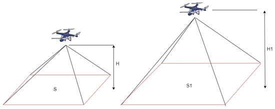 When a UAV is in flight with its camera pointing vertically downward and the focal length unchanged, as shown in Figure 8, there is a relationship between the camera’s field of view and the flight altitude. By determining the actual area of a certain region in the UAV image, the actual flight altitude can be calculated.