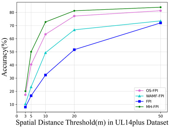 We conducted experiments on our newly adopted multi-height dataset, UL14plus. The proposed MH-FPI model was compared with three backbone models: OS-FPI [6], WAMF-FPI [23], and FPI [6]. Figure 11 shows the accuracy rates for MA@3, MA@5, MA@10, MA@20, and MA@50 under the MA evaluation metric. MH-FPI demonstrated improved accuracy within 3 m, 5 m, 10 m, 20 m, and 50 m ranges. Notably, the 5 m and 10 m metrics showed improvements of 10.4% and 11.3%, respectively, compared to the OS-FPI model. Our model backbone, by comparing satellite images with two UAV images, achieved greater improvements in accuracy within the 5–20 m range. This result aligns with our hypothesis of first performing coarse localization using larger-scale UAV images, and then conducting fine localization using smaller-scale but more detailed UAV images within the area of interest. For images where the first coarse localization produces correct results, the second fine localization yields even more precise localization effects.