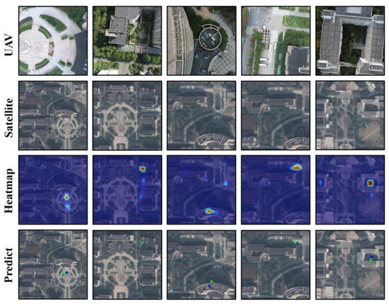 Figure 12 displays the visualization of the MH-FPI network model’s geographical localization effect. The first row shows input UAV aerial images of the query location. The second row presents corresponding satellite image maps of the query area. The third row visualizes the feature heat maps output by the network model. The fourth row shows the geographical localization results predicted using the feature heat maps, with green circles indicating true geographical locations and blue circles representing the predicted geographical locations based on the model’s output feature heat maps. Observing these result images reveals that the network model has achieved high localization performance. In some images, it is challenging to provide accurate localization results quickly through visual observation alone, whereas our network model can provide relatively precise localization results.