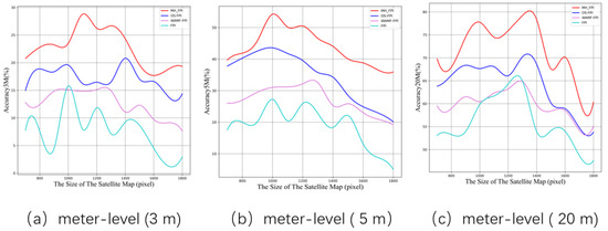 Figure 13 shows the partial meter-level (3 m, 5 m, 20 m) matching accuracies produced by satellite images of different sizes. The satellite image cropping range is from 700 to 1800, corresponding to real-world distances from 180 m to 463 m.