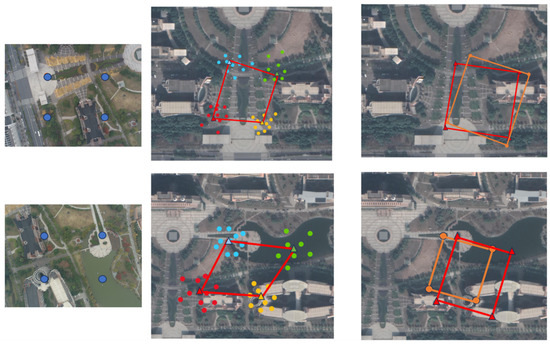 The first column is the original image of the drone, and the blue marked point is the center point of the drone mini image that is ready to be cropped. The second column shows the positions of multiple predicted coordinates generated by the cropped drone image on the satellite image (The four colored dots represent drone images that have been cropped into quarters, and each drone image predicts the resulting location, excluding outliers), the coordinates generated by taking the average, and the shape enclosed. The red part in the third column represents the predicted coordinates and the regular shapes enclosed by each drone small image with the minimum objective function after multiple predicted coordinates have passed through SQP. The orange part represents the true position of the center point coordinates of the drone image on the satellite map.