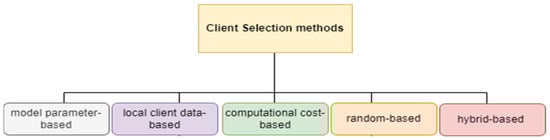 Typical applications of FL are marked by significant heterogeneity in client performance. As such, randomly selecting clients for each training cycle does not completely exploit the clients’ heterogeneous local updates, thereby diminishing the model’s accuracy, engendering a slower convergence rate, degrading fairness, and having other harmful effects. Several client selection algorithms that promise improved performance have been developed to tackle the problem of FL client heterogeneity []. These can be classified into five groups, namely model parameter-based, local client data-based, computational resources-based, random-based, and hybrid-based client selection strategies, as shown in Figure 1.
