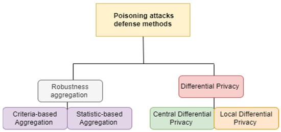 In a poisoning attack, the attacker tries to manipulate the global FL model to degrade its performance. Two types of poisoning attacks can result in poisoned updates: (1) a data poisoning attack while gathering local data; and (2) a model poisoning attack, which disrupts the local model training process. Both types of poisoning attacks aim to modify a target model’s behavior in an undesirable way. The defense methods against poisoning attacks are robustness aggregation and Differential Privacy (DP) [,] (Figure 2).