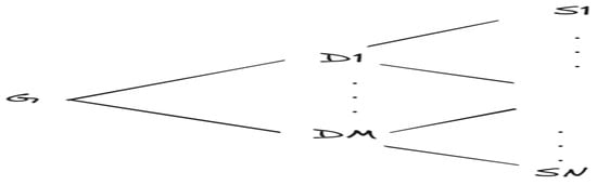 Let denote the global server, the number of data concentrators as = {D1,…, DM}, and the number of smart meters as = {S1,…, SN}, where is less than , as one data concentrator is connected to multiple smart meters. The system is represented in Figure 3: