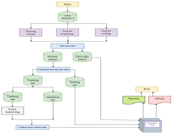 AMI networks are IP-based systems, and the same cyberattacks that afflict IT systems threaten to disrupt AMI systems []. In this work, the CICIDS2017 [] dataset was used to build and validate the proposed model. CIC-IDS2017 is provided by the Canadian Institute of Cybersecurity (CIC) and is considered one of the most critical datasets as it contains up-to-date threats that are not represented by older datasets []. It includes 2,522,362 various flows, of which 2,096,484 are normal flows and 425,878 are attack flows with 79 various features. This dataset covers 15 different classes: A normal type and 14 attack types, including DoS Hulk, DDoS, PortScan, DoS GoldenEye, FTP Patator, DoS Slowloris, DoS Slowhttptest, SSH Patator, Bot, Web Attack: Brute force, Web attack: XSS, Infiltration, Web Attack: SQL injection, and Heartbleed.