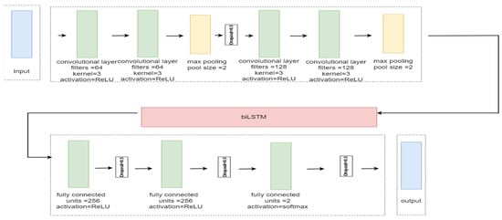 The proposed system employs a hybrid CNN and biLSTM deep learning model, and Figure 5 depicts the proposed architecture. The proposed CNN model consists of four convolutional layers. The number of filters is 64 for the first two convolutional layers and 128 for the latter two. The Rectified Linear Unit (ReLU) activation function is used for each layer, with a kernel size of three. The ReLU is computed as in Equation (14) []: