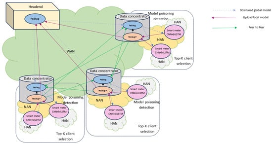 Federated learning (FL) is a decentralized method of machine learning (ML) that allows cohorts of users to collectively train a shared model through the exchange of model parameters rather than relying on streams of raw data sent to cloud servers, which are inherently vulnerable to attack []. In federated learning, clients compute updates for the server, and they only communicate this update. These updates are specifically deployed to enhance current ML models and do not require storage once applied, ensuring data privacy. Federated learning also shields the cloud from potential attacks, restricting the attack surface to only the device. The added benefits of reduced latency and network bandwidth requirements make federated learning attractive for AMI services []. Conceptually, federated learning revolves around two primary components: data clients and an aggregation server []. It is generally iterated in three steps as follows: first, the aggregation server stores a global model and sends it to its clients; second, the data clients utilize their local training data and communicate the shared local training parameters with the aggregation server; and finally, the aggregation server updates its global model based on the received shared parameters by incorporating the shared parameters according to an aggregation strategy. The FL method has benefits in terms of the use of low-cost ML models on devices such as sensors and cell phones. In addition, FL permits algorithms to acquire experience, which is another feature that conventional machine learning techniques do not always guarantee [].