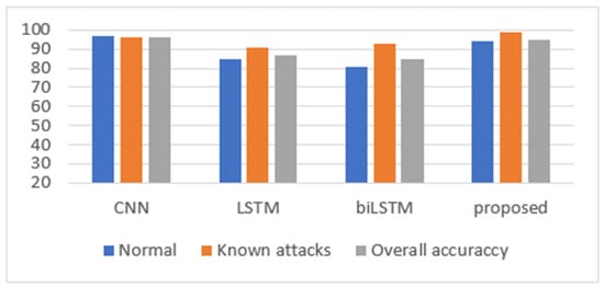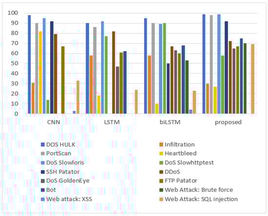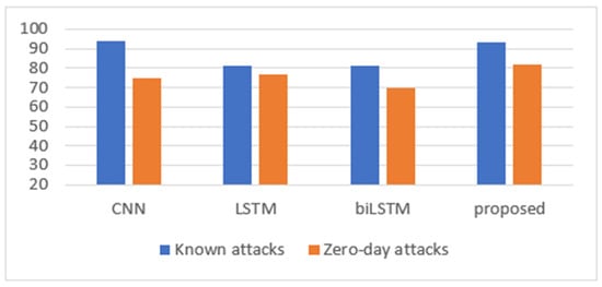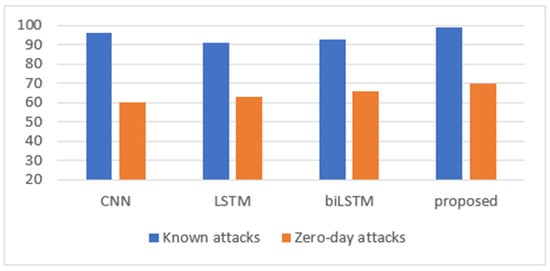 However, for the zero-day attack, combining CNN and biLSTM in a single hybrid model enhances the detection accuracy for DoS GoldenEye, FTP Patator, Web Attack: Brute Force, Bot, and Web Attack: SQL Injection. Moreover, Web attack: XSS has shown poor performance for all models and 0 accuracy for the proposed model. For the DDoS, the proposed CNN+biLSTM model achieved the average results of CNN and biLSTM.
