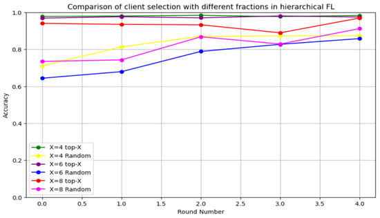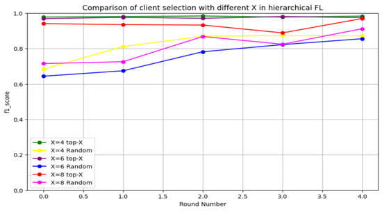 We initially investigated the impact of varying X on HFL performance. We used three different X sizes, X = 0.4, X = 0.6, and X = 0.8, with 10 clients. A performance evaluation with different X values using the CICIDS2017 dataset over a total of five rounds is illustrated in Figure 12. The proposed client selection method—top-X based on performance—significantly improved the accuracy compared to random selection across all X values. However, the effect of X was considerable, particularly for smaller X values. X = 0.8 yielded the lowest accuracy performance, while X = 0.2 generated the highest accuracy enhancement. Choosing the top-X means allowing only the X-highest clients to participate in aggregation and preventing the low-performance clients from affecting the global model performance. Additionally, decreasing the value of X leads to an increase in the global model’s performance. Thus, the CICIDS 2017 dataset evaluation demonstrated that FedAvg-P can improve the performance of FedAvg.