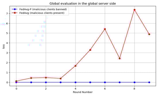 The results show that the undetected model poisoning attacks in FedAvg in the HFL system led to a degraded global model performance in terms of accuracy, DR, and F1 score. Moreover, the target of the poisoning attacks was achieved, minimizing the global accuracy to about 49%. On the other hand, the proposed FedAvg-P could isolate malicious smart meters and ban them from the FL system without affecting the global model performance, reaching 89% accuracy. Figure 14 compares the loss rate of the system with and without detecting poisoning attacks as the number of rounds increases. It shows that detecting attacks keeps the loss rate low (near 0), which is the goal of the FL system.