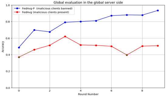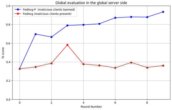 Furthermore, we investigated the F1 score to provide a comprehensive evaluation, as illustrated in Figure 13. The performance of the proposed FedAvg-P was superior to random client selection in FedAvg. The proposed FedAvg-P enhanced the overall performance in terms of accuracy and F1 score.