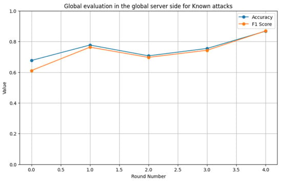 Relationship between the accuracy, F1 score, and number of rounds for known attacks.