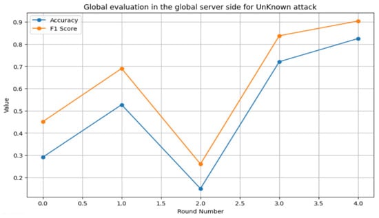 The results demonstrate that the proposed system can effectively develop a reliable anomaly detection system for AMI networks. The system revealed its ability to detect known attacks with an accuracy of 86% and an F1 score of 86% for the CIC-IDS2017 dataset, while achieving a high F1 score (90%) and accuracy (82%) for zero-day attacks in the same dataset. In addition, the system selected the high-contribution smart meters based on their local parameters due to their effect on the heterogeneous environment of the AMI network. Furthermore, these results indicate its ability to detect and remove malicious smart meters from the system. Figure 17 illustrates the relationship between accuracy, F1 score, and the number of rounds for known attacks, while Figure 18 shows the relationship between accuracy, F1 score, and the number of rounds for zero-day attacks. These figures show that increasing the number of rounds improves system performance for both known and zero-day attacks.