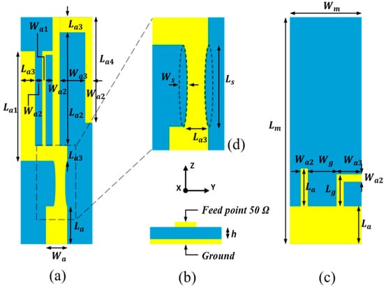 The structure of the compact multiband monopole antenna. (a) Front view. (b) Bottom view. (c) Back view. (d) Detail view.