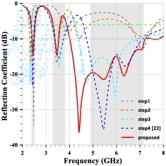 Figure 3 shows the reflection coefficients of the five-step antennas. The under −10 dB bandwidth becomes progressively wider with each evolution step, and the impedance matching improves, especially at higher bands. The reflection coefficient of the proposed antenna has six frequency resonant points: 2.46 GHz, 3.47 GHz, 4.41 GHz, 5.45 GHz, 6.32 GHz, and 7.06 GHz, respectively. These frequency resonance points determine and satisfy the bandwidth and performance requirements for the compact multiband monopole antenna.