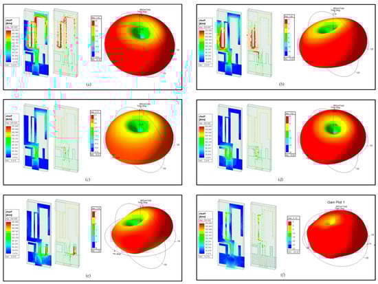 Figure 4a shows the current distribution of the antenna at the resonance frequency of 2.46 GHz, which exhibits the standard quarter-wavelength current distribution along the middle arm. This means the maximum current occurs at the shorted end and decreases to zero at the open end. Figure 4b exhibits a U-shaped and half-wavelength current distribution along the left arm and the parallel arm at 3.47 GHz. This means the maximum current occurs in the middle of the U-shape and decreases to zero at the two open ends. Despite the opposite current directions, they do not cancel each other out and still radiate electromagnetic power effectively. Figure 4c shows the three-quarters wavelength current distribution along the middle arm at 4.41 GHz. This means the current flows from maximum to zero, then to another maximum, and back to zero, with the current direction remaining mostly in phase. This frequency resonance point is key to creating more bandwidth. Figure 4d exhibits another U-shaped and half-wavelength current distribution along the left arm of the ground and the middle arm at 5.45 GHz. The current flows similarly to Figure 4b and still radiates electromagnetic power effectively. Figure 4e exhibits a current distribution similar to Figure 4d but with the distribution along the right arm of the ground at 6.32 GHz, where the current flows similarly to Figure 4b and radiates electromagnetic power effectively. Figure 4f shows a different current distribution. The current along the half-wavelength rectangular slot radiates electromagnetic power. This rectangular slot is formed by the middle arm and the parallel arm. The current flows similarly to an inductive slot resonator, with zero current occurring in the middle of the longer side of the rectangular slot and maximum current appearing at the shorter sides of the rectangular slot.