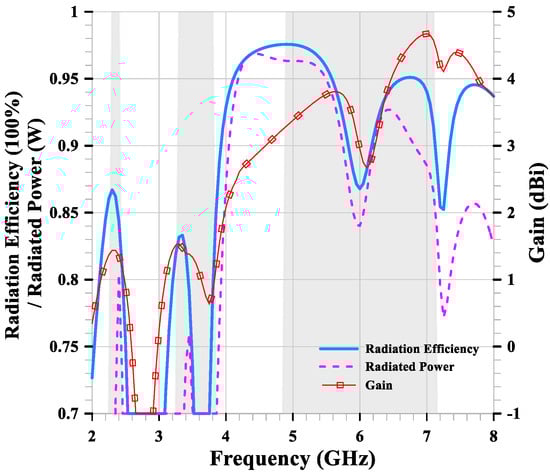 The radiation efficiency, radiated power, and gain of the compact multiband monopole antenna.