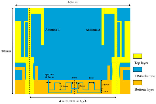 The configuration and dimensions of the MIMO antenna structure are shown in Figure 6. The distance between antenna 1 and antenna 2 is 30 mm, which corresponds to a quarter-wavelength of the lowest resonance frequency 2.46 GHz. The 30 mm distance is considered for a scenario where WiFi-7 standard access points (APs) need to place 16 antennas [] within a limited space. However, because the two antennas are close to each other, the lower two frequencies experience strong mutual coupling. Therefore, the design targets for suppression are these frequencies. The two antennas are placed opposite each other and share a common ground. The middle of the ground has two meander slits, with the slits having a common open end on both sides. The length of the upper meander slit is 41 mm, and the lower meander slit is 29 mm, corresponding to half-wavelengths at 2.46 GHz and 3.47 GHz, respectively. Here, the length of the slits is calculated using the same method as Equation (1), with the only change being the constant coefficient adjusted to 2. The effective permittivity derivative is calculated using Equation (2) and set to approximately 2.2. Here, represents relative permittivity.