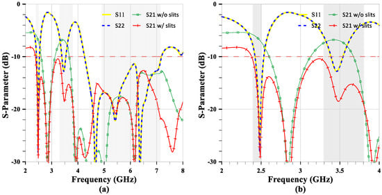 Figure 7a shows the simulation S-parameters of the MIMO antenna. The reflection coefficients and are the same, and their bandwidths are similar to the single element, with the only difference starting at the higher band from 4.2 GHz. Figure 7b exhibits the detailed transmission coefficient or isolation , with and without slits on the ground. Comparing the with and without slits shows mutual coupling suppression from −6.5 dB and −6.8 dB to −29.4 dB and −18.5 dB at 2.46 GHz and 3.47 GHz, respectively. The suppression is 22.9 dB and 11.7 dB, corresponding to a reduction in mutual coupling by 195 and 14.8 times. In the higher frequency band, the mutual coupling is always under −15 dB, indicating sufficient distance between elements. However, there is a peak at −12 dB at 6.5 GHz because the effective wavelength () is 19.86 mm at 6.5 GHz (). The 30 mm antenna separation distance is approximately 1.5, which excites resonance and causes stronger mutual coupling, resulting in peak isolation at −12 dB.