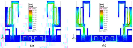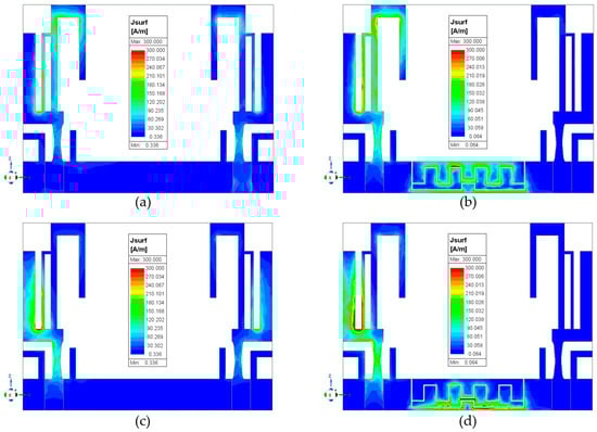 A more direct way to observe the effect of the method for reducing mutual coupling is from the current distribution of the MIMO antenna. Figure 8 shows the current distribution of the MIMO antenna. Observing Figure 8a, one can see that antenna 1’s electromagnetic interference causes an inductive current on antenna 2 when antenna 1 is excited at 2.46 GHz and antenna 2 is terminated. However, in Figure 8b, there is no inductive current on antenna 2; instead, the conductive current is observed on the upper meander slit. Therefore, the authors believe that the mutual coupling path consists of two components: one from the electromagnetic (EM) wave and the other from the common ground. Most of the coupling energy likely follows the second path, as Figure 8b demonstrates that the coupling energy is absorbed or re-radiated into the air by the upper meander slit on the ground. From the observed conductive current on the upper meander slit, which has maximum current in the middle and zero current at both open ends, it is evident that this condition matches the previously calculated half-wavelength slit. Furthermore, in Figure 8c,d, the conditions are similar to the previous observations, with only the excitation frequency changing to 3.47 GHz and the decoupled conductive current observed on the lower meander slit.