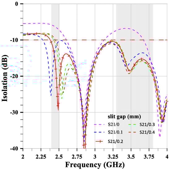 The relationship between isolation and slit gap is shown in Figure 9. The gap of the two slits is the same size. When the gap changes from 0.1 mm to 0.4 mm (with 0 mm representing no slits), the isolation remains largely unchanged, with suppression around −18 dB at 3.47 GHz. However, there is a significant change at 2.46 GHz. As the gap increases, the resonant frequency shifts from lower to higher values. Therefore, the authors chose a gap of 0.2 mm for the manufacturing parameter because it provides the correct resonant frequency at 2.46 GHz and achieves deeper suppression at −29.4 dB.
