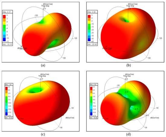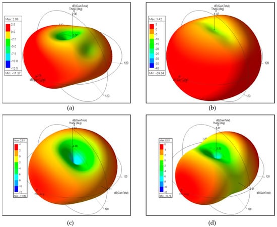 The radiation pattern of the MIMO antenna at 3.47 GHz: (a) without slits and with antenna 1 excited and antenna 2 terminated, or (b) with both antennas excited; (c) with slits and with antenna 1 excited and antenna 2 terminated, or (d) with both antennas excited.