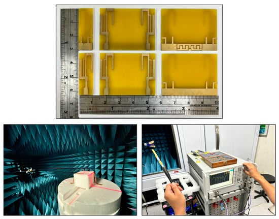 This chapter covers the implementation details and the measurement results of the proposed antenna designs, as shown in Figure 13. The antennas were fabricated on a single-layer FR4 board with a thickness of 1.6 mm, a relative permittivity () of 4.4, and a copper thickness of 35 um. Their performance was evaluated using an Agilent PNA network analyzer—N5277A and an anechoic chamber. The key parameters measured include reflection coefficients, radiation patterns, and gain.