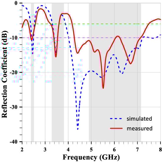 Figure 14 shows the measured and simulated reflection coefficients of the compact multiband monopole antenna. The measurements indicate good agreement with the simulations, validating the design of the antenna. The antenna exhibits multiband characteristics with reflection coefficients below −10 dB at the targeted frequency bands. However, at 2.46 GHz, the reflection coefficient is only −10.2 dB, and it is almost the same at 3.47 GHz. Additionally, within the highest band, from 4.4 GHz to 7.1 GHz, the measured bandwidth is 400 MHz less than the simulated bandwidth.