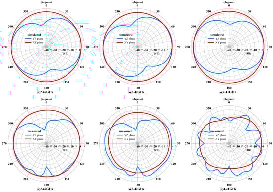 The measured and simulated radiation patterns of the MIMO antenna with both antennas excited are shown in Figure 18 and Figure 19, respectively. The patterns demonstrate good directional coverage in the azimuth angle (XY plane). The gain decreases noticeably as the frequency increases. The elevation angle (YZ plane) also exhibits a similar trend and is not smooth. Due to the measured frequency points not resonating at the same frequencies as the simulated points, there are notable differences, especially at 4.41 GHz, where it is not even below −6 dB.