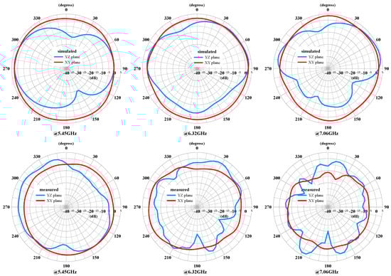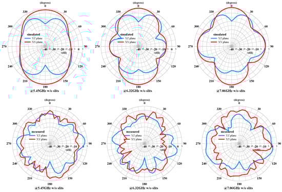 The measured and simulated radiation patterns of the MIMO antenna with slits at 5.45 GHz, 6.32 GHz, and 7.06 GHz.