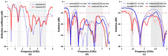 The measured and simulated reflection coefficients of the MIMO antenna with slits, with both antennas excited, are shown in Figure 17. The measurements indicate good agreement with the simulations at the lower two bands, but there is a narrower bandwidth, as shown in Figure 17a, at the higher band. However, the reflection coefficient is almost below −10 dB at that band and covers the required bandwidth. The measured and simulated isolations of the MIMO antenna with and without slits, with both antennas excited, are shown in Figure 17b,c. Those isolations follow a similar trend and are below −13 dB at the higher band. Furthermore, Figure 17c shows the difference between the MIMO antennas with and without slits. The simulated and measured curves are quite close at the 2.4 GHz band, highlighting an impressive reduction in mutual coupling. However, there is only a 4 dB reduction in mutual coupling at 3.47 GHz, but another suppression response occurs at 3.2 GHz, showing the same level of isolation as the simulation. This may be the designed suppression frequency, but the lower meander slit is too long for some unknown reason. Additionally, there are two response frequencies at 2.8 GHz and 3.9 GHz, respectively. These frequencies result from the physical size and first-order harmonics, and all four curves exhibit the same response frequencies.