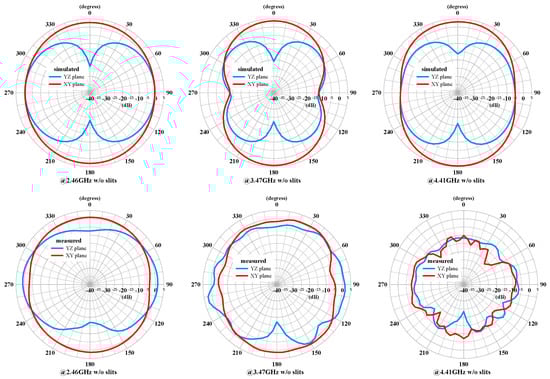 The measured and simulated radiation patterns of the MIMO antenna with slits at 2.46 GHz, 3.47 GHz, and 4.41 GHz.