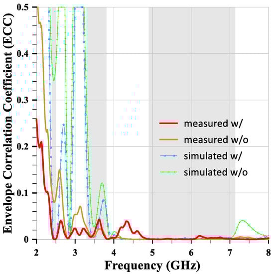The measured and simulated ECC values of the MIMO antennas with and without slits.