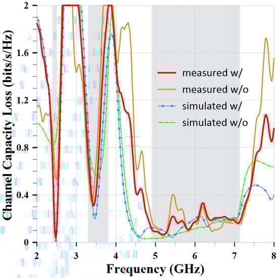 The Channel Capacity Loss (CCL) is also an important parameter for evaluating MIMO antenna systems. The CCL value represents the data loss in bits per second per Hertz due to channel conditions. Therefore, the smaller the CCL value, the better. A CCL value below 0.4 bits/s/Hz can be considered excellent channel conditions. Formulas (4)–(7) are used to calculate the CCL values.