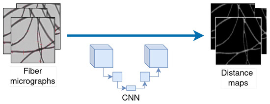 Deep-learning-based methods for solving computer vision problems have increased significantly, generating excellent results compared with methods that use classical procedures [16]. In the context of generating distance maps, we identified an FIDT map, introduced by Liang et al. [17], and the DIST technique, introduced by Naylor et al. [11]. While the former proposes distance map prediction for crowd localization, the latter performs nuclei segmentation in histopathology images through distance transform prediction and subsequent U-Net-based processing [18]. Additionally, Huang et al. [12] proposed a two-stage method for left atrium segmentation. It generates the distance map in the first stage to enhance atrium segmentation using U-Net in the second stage. These findings demonstrate the capabilities of neural networks for distance map generation. Therefore, our proposal builds upon these approaches to generate distance maps from fiber micrographs.